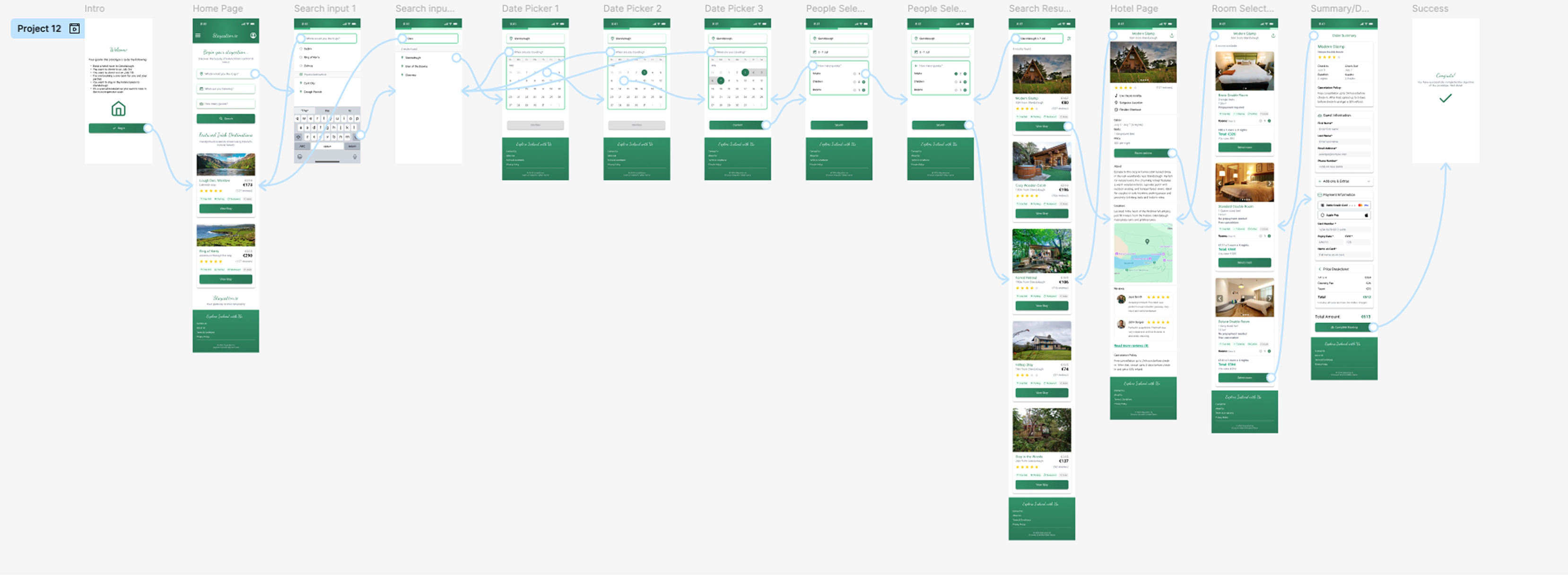 One of my favourite parts of the design process was interaction mapping in the Prototype tool of Figma. Having worked in the games industry as a UX engineer, this came to me very naturally. Below is the entire interaction flow from the start of the process until the final success screen once a room is booked.