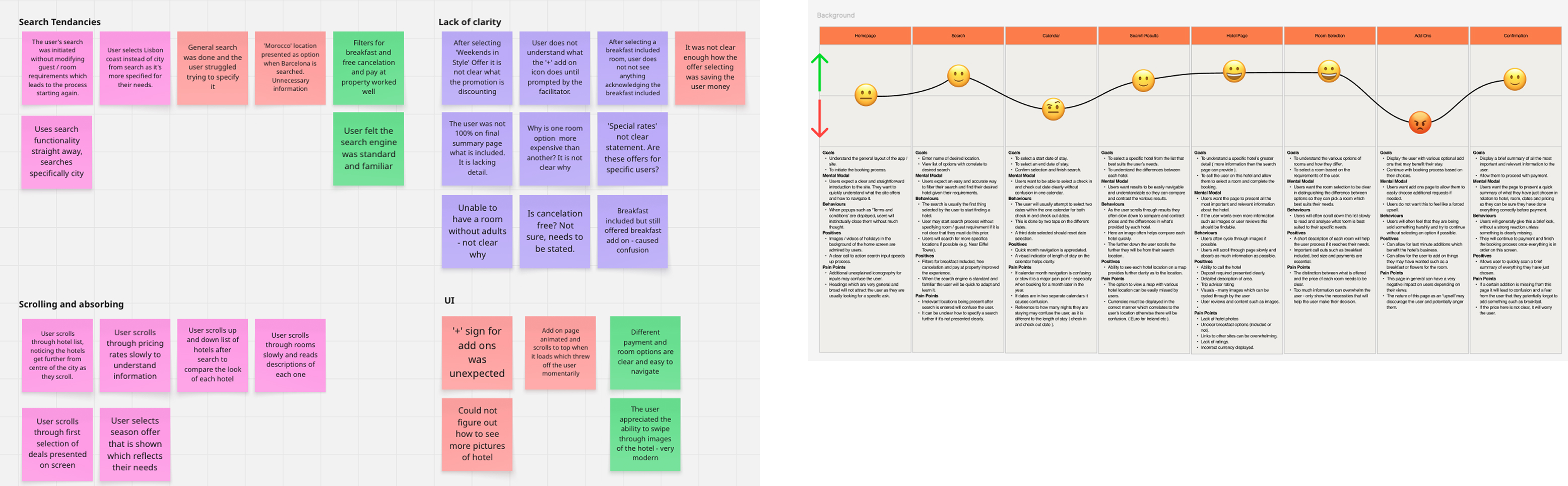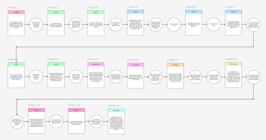 To understand and optimise the user journey, I created a user flow diagram to represent visually the steps a user takes to accomplish the goal of booking a hotel room. Circular nodes represent actions and the rectangular nodes represent screens, colour coded to make them easier to perceive.