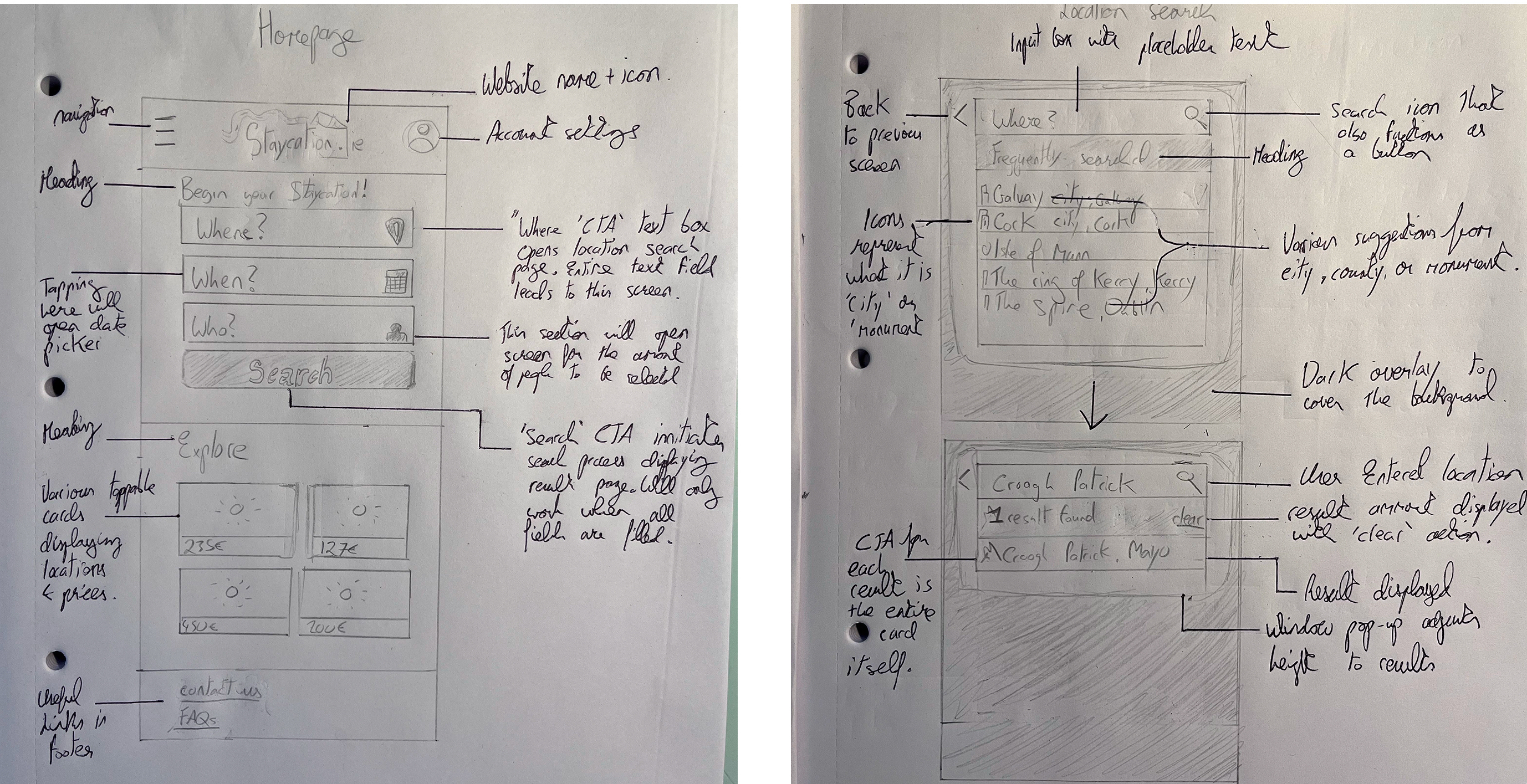 UX Design institute insisted at this stage of the process to create wireframes the old school method - pencil and paper. I drew out every screen in the interaction design process by hand using a H2 pencil and explaining each part of a screen in pen as seen below.